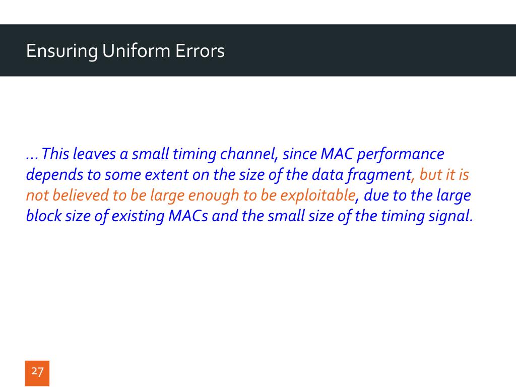 Ensuring Uniform Errors • … This leaves a small timing channel, since MAC performance depends to some extent on the size of the data fragment, but it is not believed to be large enough to be exploitable, due to the large block size of existing MACs and the small size of the timing signal. 26