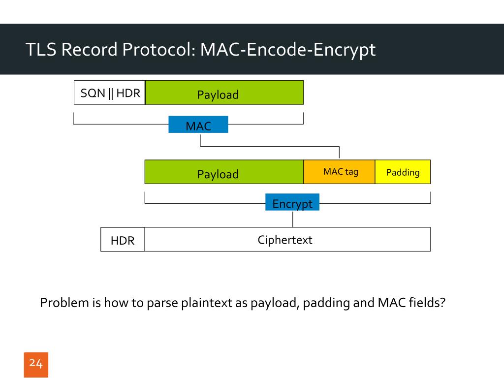 SQN || HDR Padding MAC tag TLS Record Protocol: MAC-Encode-Encrypt Payload MAC Payload Encrypt Ciphertext HDR Problem is how to parse plaintext as payload, padding and MAC fields? 24