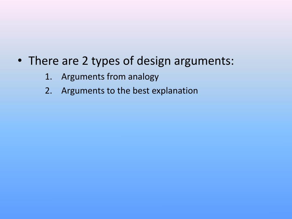 There are 2 types of design arguments: • Arguments from analogy • Arguments to the best explanation