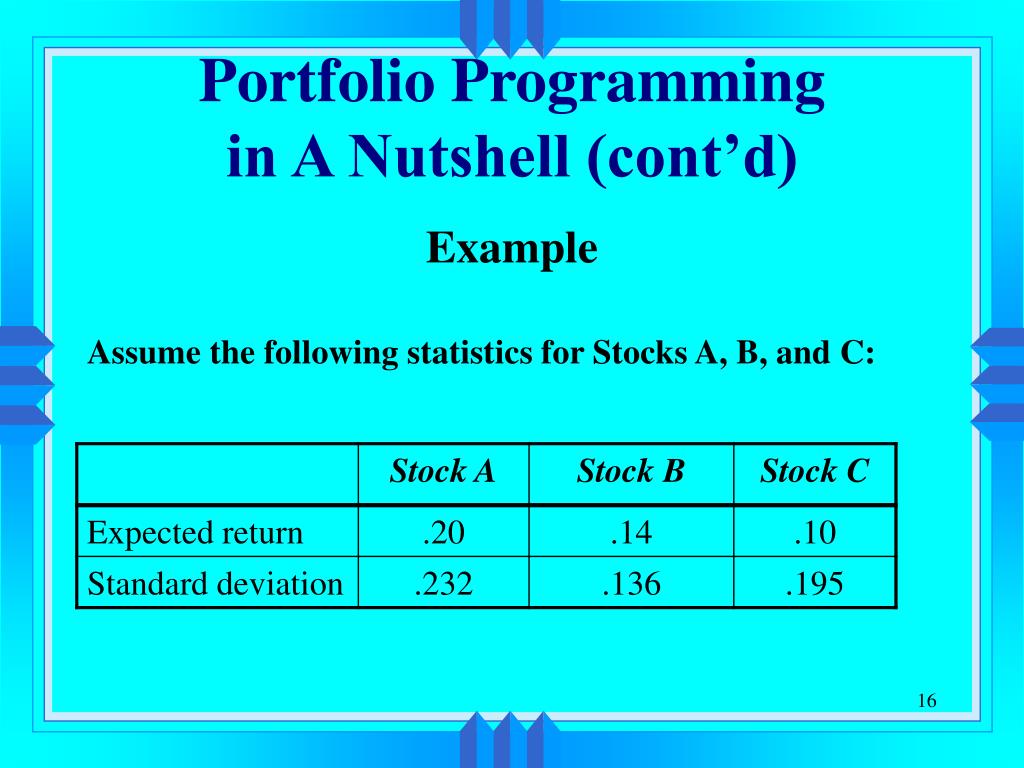 Portfolio Programming in A Nutshell (cont’d) Example Assume the following statistics for Stocks A, B, and C: