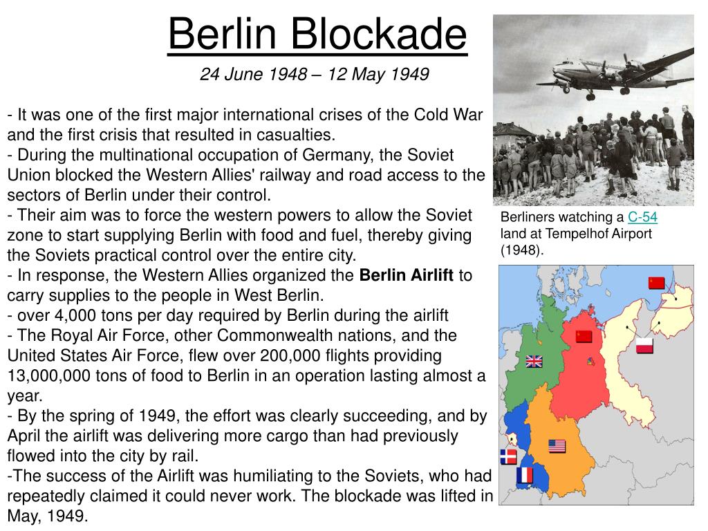 24 June 1948 – 12 May 1949 Berlin Blockade • It was one of the first major international crises of the Cold War and the first crisis that resulted in casualties. • - During the multinational occupation of Germany, the Soviet Union blocked the Western Allies' railway and road access to the sectors of Berlin under their control. • Their aim was to force the western powers to allow the Soviet zone to start supplying Berlin with food and fuel, thereby giving the Soviets practical control over the entire city. • In response, the Western Allies organized the Berlin Airlift to carry supplies to the people in West Berlin. • over 4,000 tons per day required by Berlin during the airlift • The Royal Air Force, other Commonwealth nations, and the United States Air Force, flew over 200,000 flights providing 13,000,000 tons of food to Berlin in an operation lasting almost a year. • By the spring of 1949, the effort was clearly succeeding, and by April the airlift was delivering more cargo than had previously flowed into the city by rail. • The success of the Airlift was humiliating to the Soviets, who had repeatedly claimed it could never work. The blockade was lifted in May, 1949. Berliners watching a C-54 land at Tempelhof Airport (1948).