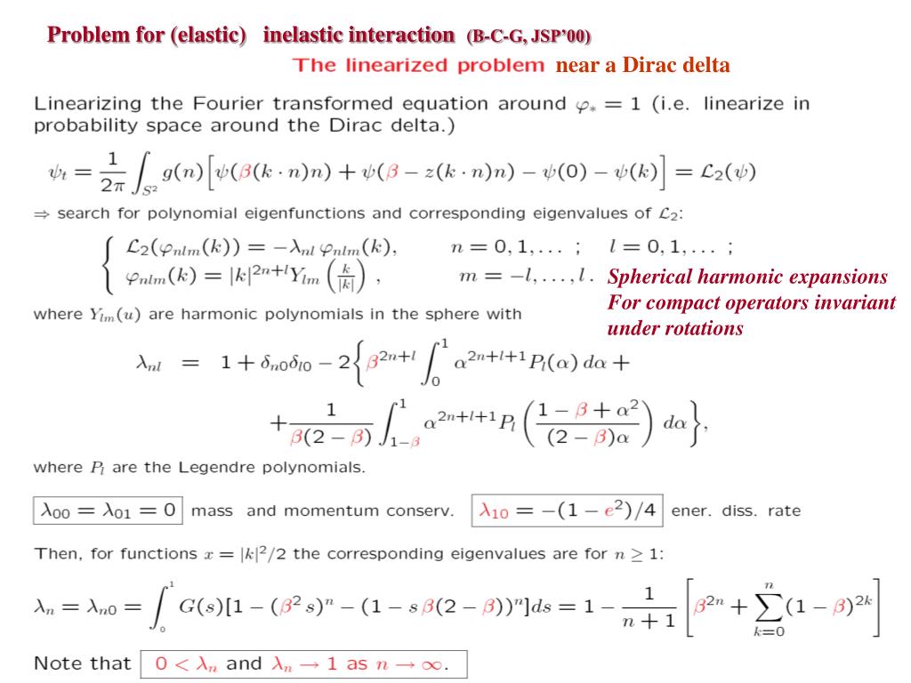 Recall fromFourier transform: nthmoments of f(., v) are nth derivatives of φ(.,k)|k=0 Θ And, for isotropic (x = |k|2/2 ) or self similar solutions (x = |k|2/2 eμt, μ is the energy dissipation rate, that is: Θt = - μΘ ),by performing the operations with , then, the Fourier transformed collisional operator is written Kd accounts for the integrability of the functionb(1-2s)(s-s2)(N-3)/2 For isotropic solutions the equation becomes (after rescaling in time the dimensional constant) φt + φ = Γ(φ , φ ) ; φ(t,0)=1, φ(0,k)=F (f0)(k), Θ(t)= - φ’(0) In this case, using the linearization of Γ(φ , φ ) about the stationary state φ=1, we can inferred the energy rate of change by looking at λ1 defined by kinetic energy is dissipated < 1 λ1:=∫10 (aβ(s) + bβ(s)) G(s) ds= 1kinetic energy is conserved > 1 kinetic energy is generated