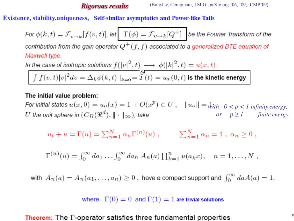 Rigorous results (Bobylev, Cercignani, I.M.G.;.arXig.org ’06, ’09,- CMP’09) Existence, stability,uniqueness, Θ with 0 < p < 1 infinity energy, or p ≥ 1 finite energy