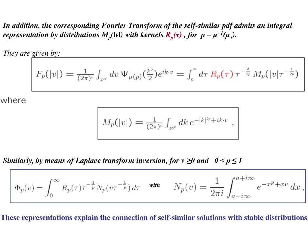 In addition, the corresponding Fourier Transform of the self-similar pdf admits an integral representation by distributionsMp(|v|)with kernels Rp(τ) , for p = μ−1(μ∗). They are given by: Similarly, by means of Laplace transform inversion, for v ≥0 and 0 < p ≤ 1 with These representations explain the connection of self-similar solutions with stable distributions
