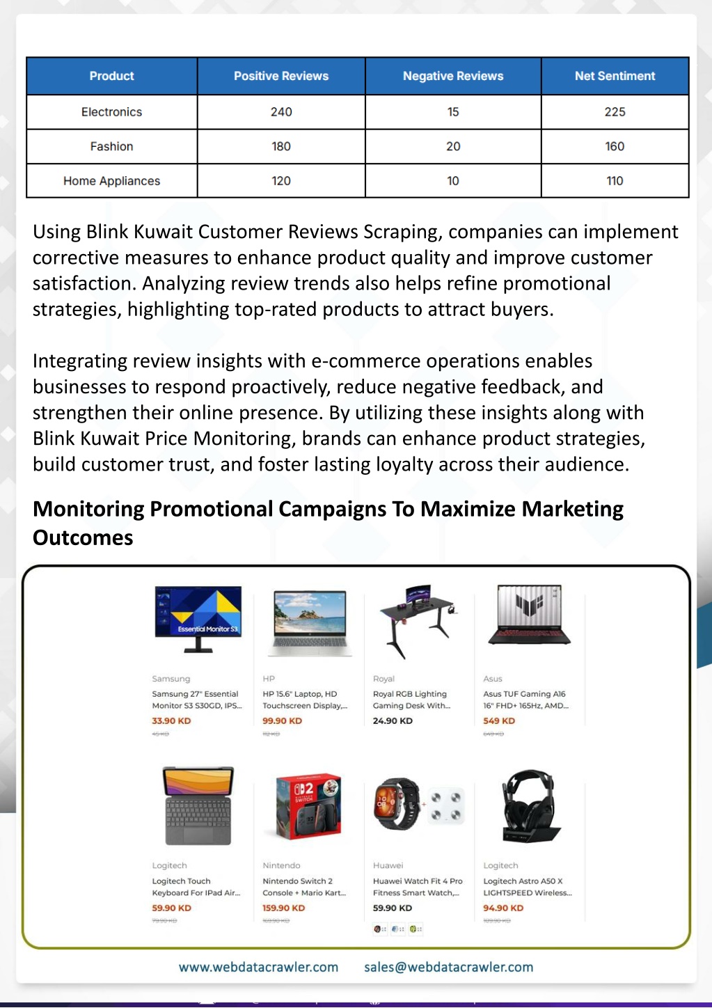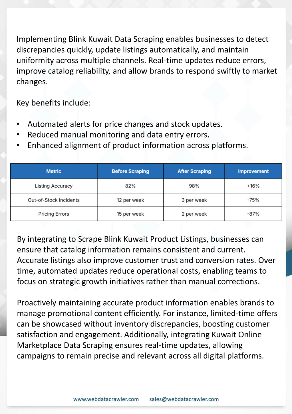 Our services include: • • • • • Automated monitoring of online stores and competitors. Extraction of product information for strategic planning. Dynamic tracking of pricing and promotions. Inventory monitoring to prevent stockouts. Review and sentiment analysis for customer feedback. Understanding Web Scraping Foodhub Reviews • Campaign performance evaluation to refine marketing. Through our solutions, businesses can utilize Blink Kuwait Price Monitoring to track competitors’ pricing strategies and adjust their offerings efficiently. The combination of advanced scraping techniques and detailed analytics ensures actionable insights and measurable Introduction results. This case study highlights how our Coupang Product Price Scraping Service revolutionized a client's market analysis and pricing optimization strategy. By deploying advanced techniques, we empowered the client with unmatched insights into the competitive dynamics of South Korea's leading e-commerce platform. Optimizing e-commerce strategies in Kuwait is increasingly reliant on Web Scraping Blink Kuwait Data. By implementing real-time data collection, businesses can maintain accurate product listings, monitor competitor pricing, and manage inventory efficiently. This proactive approach enhances customer satisfaction, increases sales, and strengthens overall market positioning. Conclusion Introduction In today's dynamic quick-commerce landscape, staying competitive requires instant visibility into market pricing trends and consumer preferences. This case study examines how a leading grocery delivery chain with 30+ online stores across major Indian metropolitan areas leveraged Real-Time Grocery Price Monitoring solutions from us to transform their business intelligence capabilities and market positioning strategies. profit margins. Leveraging our specialized Coupang Product Data Scraping Solutions scraping tools, the client gained the strategic edge necessary to excel within Coupang's fast-evolving marketplace. The Client Additionally, integrating Kuwait Online Marketplace Data Scraping provides Our customized solution delivered robust market intelligence, enabling clients to drive data- backed pricing decisions, swiftly adapt to market changes, and significantly enhance their The client struggled with maintaining competitive pricing across thousands of SKUs and identifying regional pricing patterns. They also suffered revenue leakage due to suboptimal pricing strategies. They needed a comprehensive solution to provide detailed insights into quick-commerce market dynamics and enable precise price optimization across their diverse Web scraping involves extracting large amounts of data from websites in an automated manner. Foodhub Reviews Scraper is designed to help businesses collect customer reviews from Foodhub, a popular food delivery platform. grocery catalog. insights into customer behavior, reviews, and promotional trends, enabling informed decision-making. Companies can leverage this data to refine marketing campaigns, forecast demand, and optimize operational workflows. Contact Web Data Crawler today to implement data-driven solutions that elevate your e-commerce success. The client revolutionized their approach to pricing strategy and inventory management by By scraping reviews, ratings, and feedback from customers, businesses can gain insights into various aspects of their service, including food quality, delivery times, and customer satisfaction. implementing advanced Grocery Price Data Scraping technologies. This resulted in remarkable improvements in market responsiveness, profit margins, and substantial revenue growth. Instead of relying on manual data collection, Foodhub Reviews Data Collection through scraping allows for real-time access to a large volume of structured data, which is essential for making informed decisions. Client Success Story https://www.webdatacrawler.com/web-scraping-blink-kuwait-data.php Source: