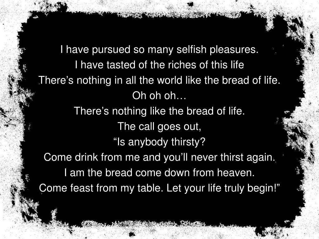 I have pursued so many selfish pleasures. I have tasted of the riches of this life There’s nothing in all the world like the bread of life. Oh oh oh… There’s nothing like the bread of life. The call goes out, “Is anybody thirsty? Come drink from me and you’ll never thirst again. I am the bread come down from heaven. Come feast from my table. Let your life truly begin!”