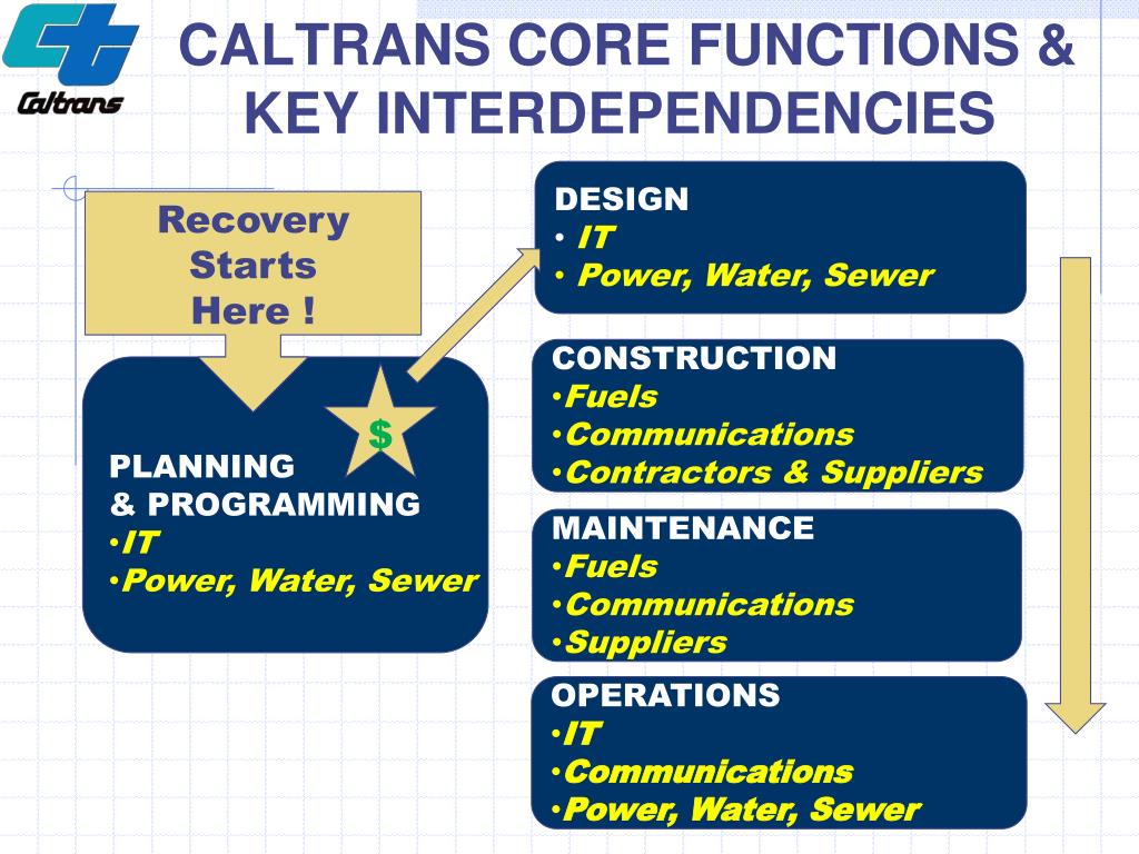 CALTRANS CORE FUNCTIONS & KEY INTERDEPENDENCIES • DESIGN • IT • Power, Water, Sewer Recovery Starts Here ! • CONSTRUCTION • Fuels • Communications • Contractors & Suppliers • PLANNING • & PROGRAMMING • IT • Power, Water, Sewer $ • MAINTENANCE • Fuels • Communications • Suppliers • OPERATIONS • IT • Communications • Power, Water, Sewer