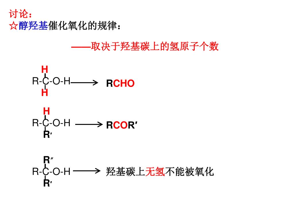 H R-C-O-H RCHO H RCOR′ H R-C-O-H R′ R〞 羟基碳上无氢不能被氧化 R-C-O-H R′ 讨论: ☆醇羟基催化氧化的规律: ——取决于羟基碳上的氢原子个数