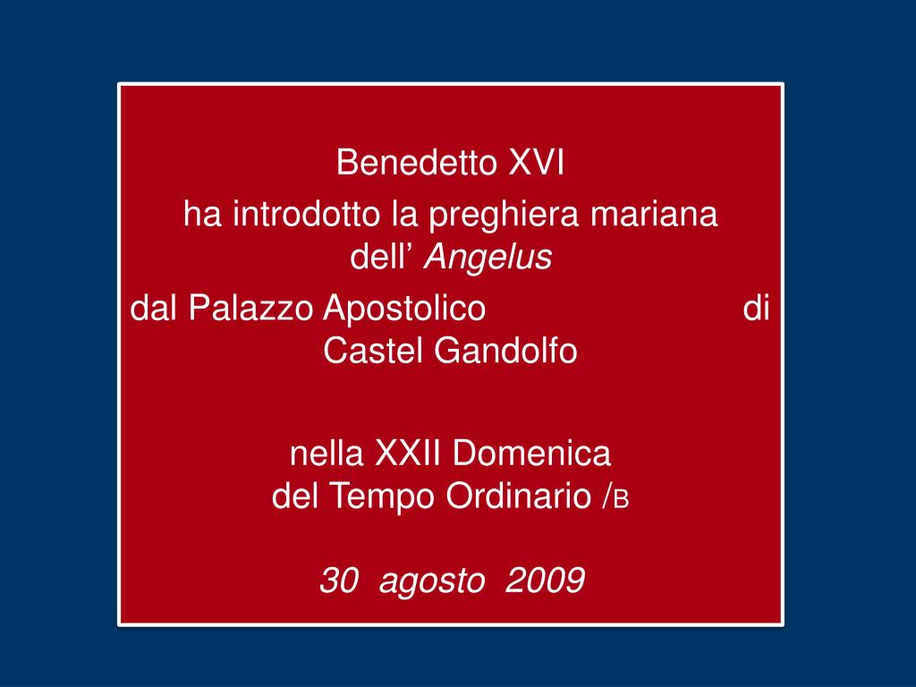 Benedetto XVI ha introdotto la preghiera mariana dell’ Angelus dal Palazzo Apostolico di Castel Gandolfo nella XXII Domenica del Tempo Ordinario /B 30 agosto 2009
