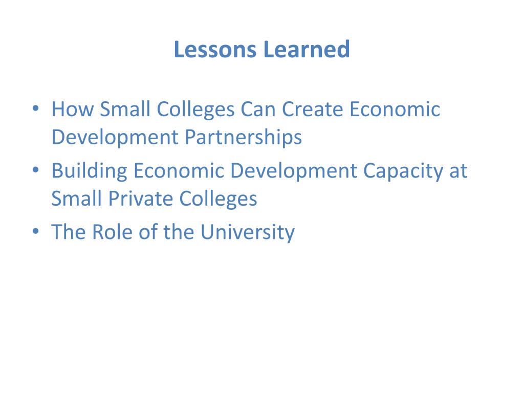 Lessons Learned • How Small Colleges Can Create Economic Development Partnerships • Building Economic Development Capacity at Small Private Colleges • The Role of the University
