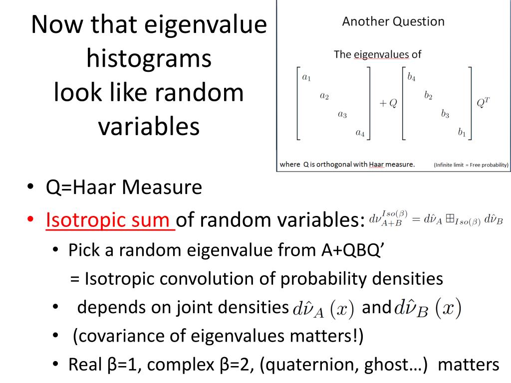 Now that eigenvalue histogramslook like random variables • Q=Haar Measure • Isotropic sum of random variables: • Pick a random eigenvalue from A+QBQ’ = Isotropic convolution of probability densities • depends on joint densities and • (covariance of eigenvalues matters!) • Real β=1, complex β=2, (quaternion, ghost…) matters