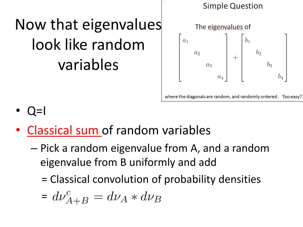 Now that eigenvalues look like random variables • Q=I • Classical sum of random variables • Pick a random eigenvalue from A, and a random eigenvalue from B uniformly and add = Classical convolution of probability densities =