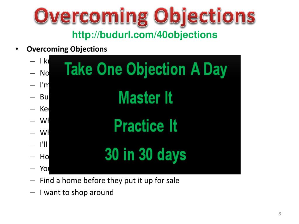 Overcoming Objections http://budurl.com/40objections • Overcoming Objections • I know someone in real estate • Not Ready to buy or sell • I'm going to sell FSBO • Buy and Sell with you / Cut commissions • Keep my promise to use past agent • What makes you different • Why are you less than everyone else • I'll sell when the values go up • How much advertising will you do • You look like you are to busy • Find a home before they put it up for sale • I want to shop around