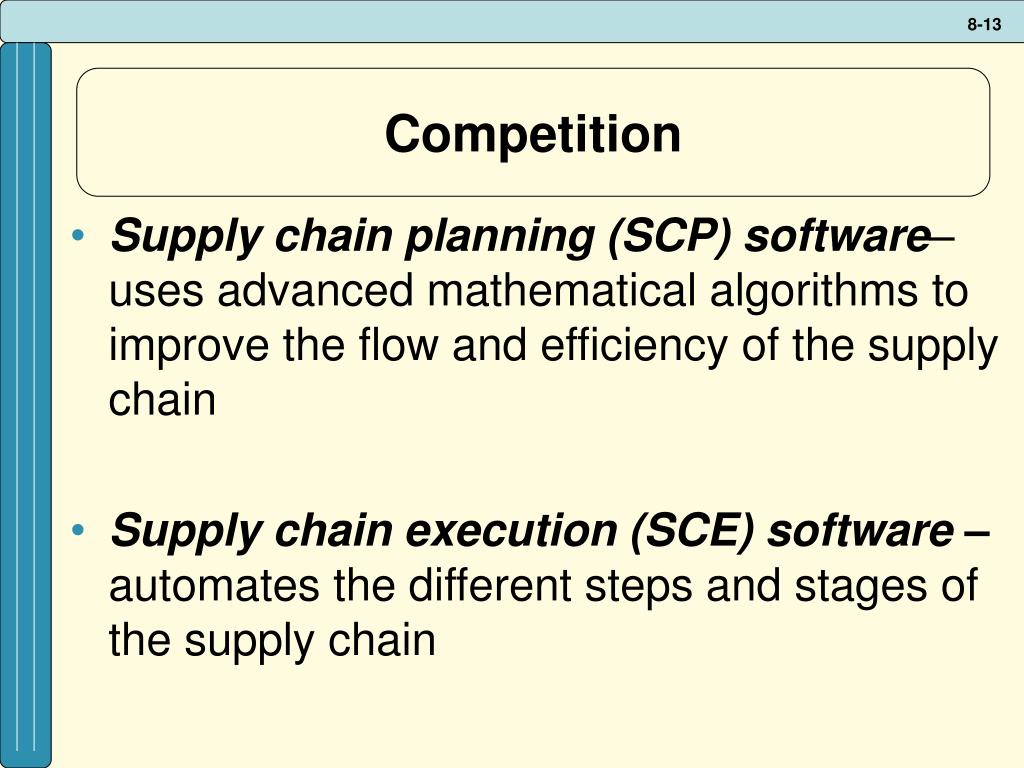 Competition • Supply chain planning (SCP)software– uses advanced mathematical algorithms to improve the flow and efficiency of the supply chain • Supply chain execution (SCE) software – automates the different steps and stages of the supply chain