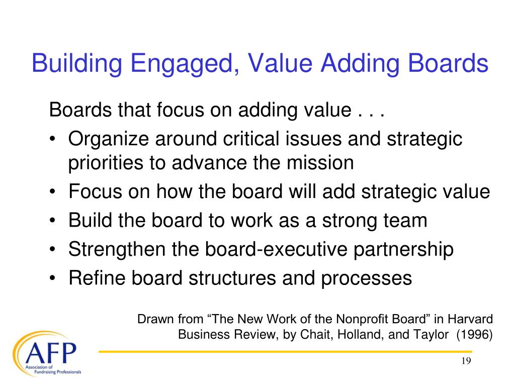 Building Engaged, Value Adding Boards Boards that focus on adding value . . . • Organize around critical issues and strategic priorities to advance the mission • Focus on how the board will add strategic value • Build the board to work as a strong team • Strengthen the board-executive partnership • Refine board structures and processes Drawn from “The New Work of the Nonprofit Board” in Harvard Business Review, by Chait, Holland, and Taylor (1996)