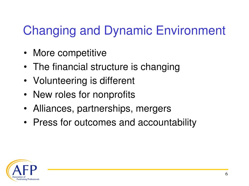 Changing and Dynamic Environment • More competitive • The financial structure is changing • Volunteering is different • New roles for nonprofits • Alliances, partnerships, mergers • Press for outcomes and accountability