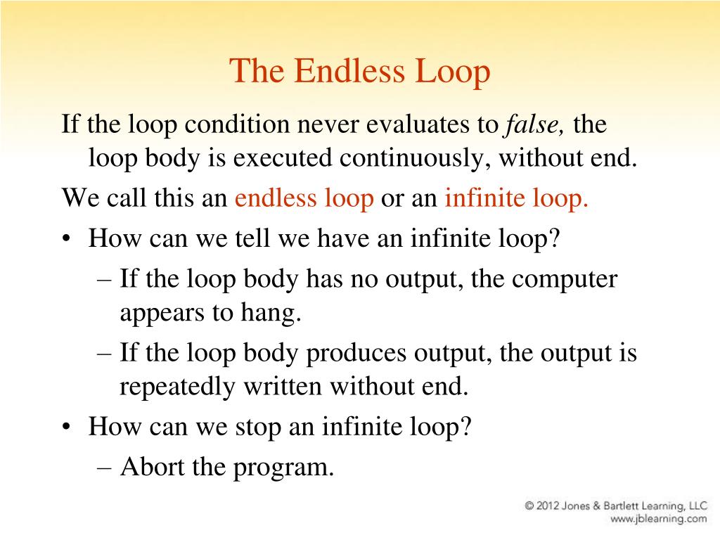 The Endless Loop If the loop condition never evaluates to false, the loop body is executed continuously, without end. We call this an endless loop or an infinite loop. • How can we tell we have an infinite loop? • If the loop body has no output, the computer appears to hang. • If the loop body produces output, the output is repeatedly written without end. • How can we stop an infinite loop? • Abort the program.