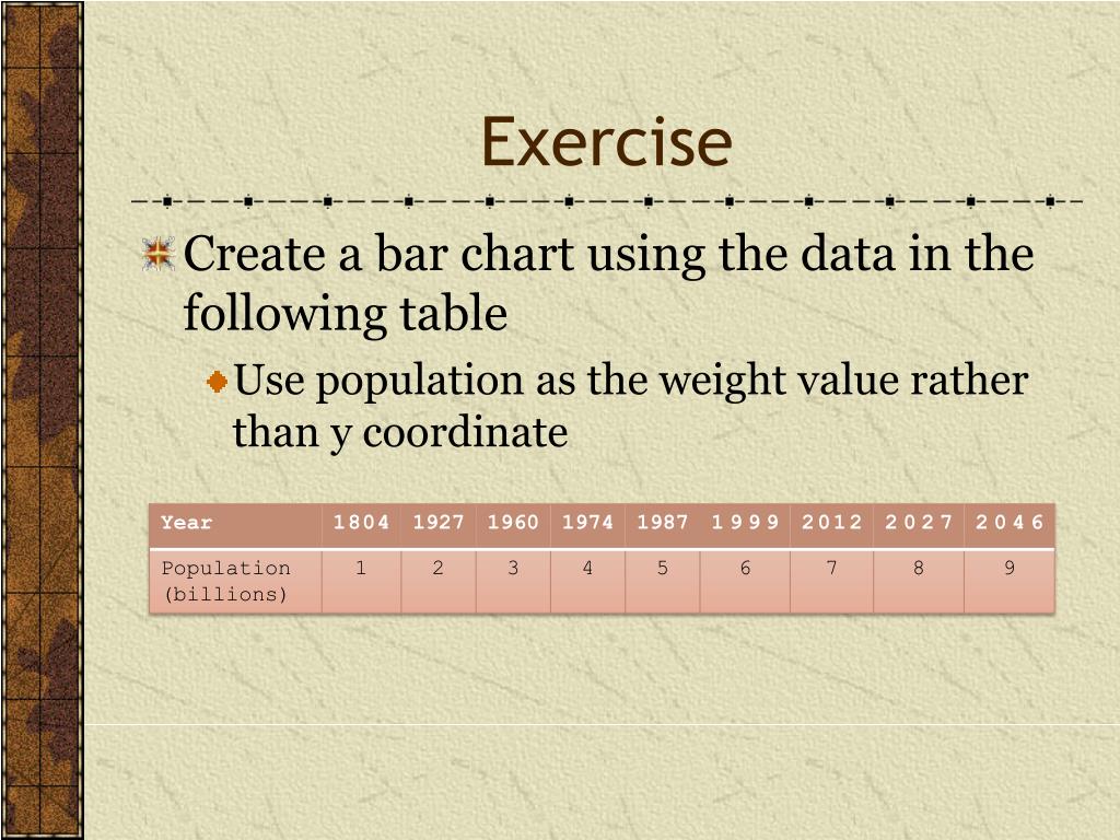 Exercise • Create a bar chart using the data in the following table • Use population as the weight value rather than y coordinate