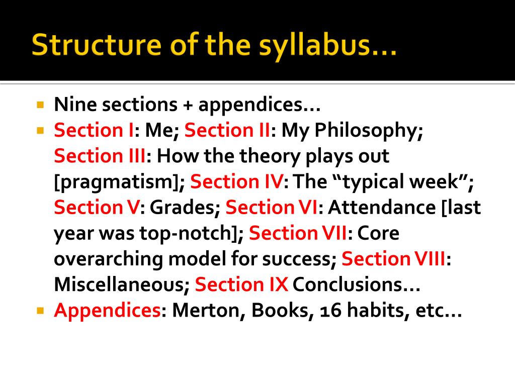Structure of the syllabus… • Nine sections + appendices… • Section I: Me; Section II: My Philosophy; Section III: How the theory plays out [pragmatism]; Section IV: The “typical week”; Section V: Grades; Section VI: Attendance [last year was top-notch]; Section VII: Core overarching model for success; Section VIII: Miscellaneous; Section IX Conclusions… • Appendices: Merton, Books, 16 habits, etc…