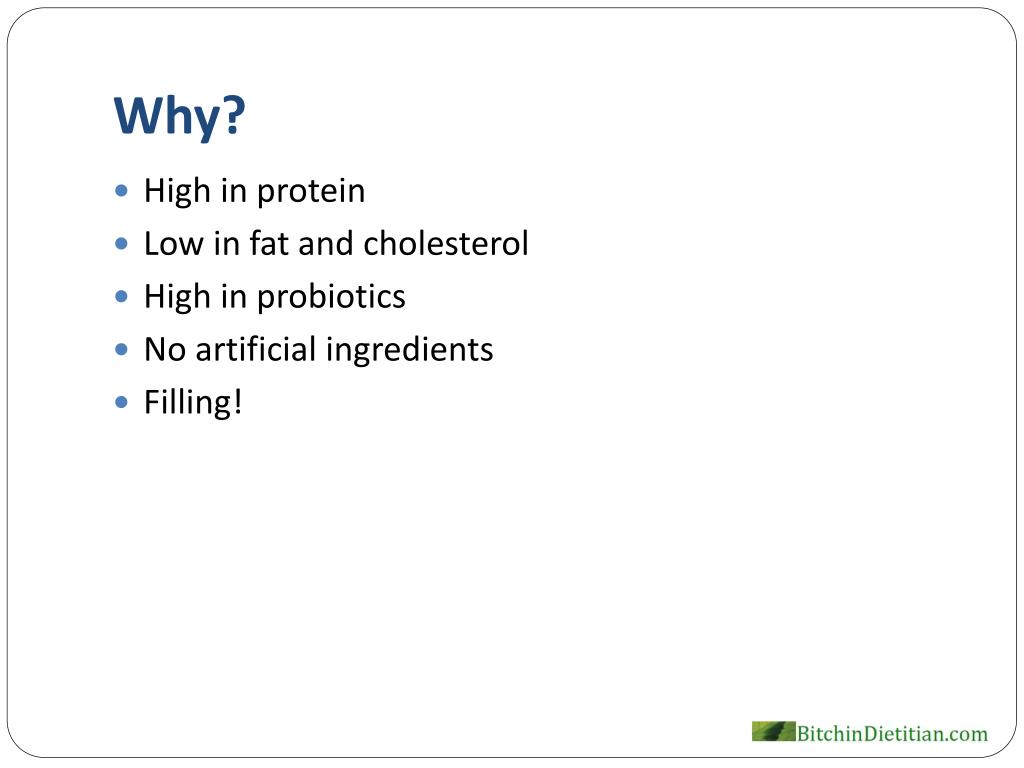 Why? • High in protein • Low in fat and cholesterol • High in probiotics • No artificial ingredients • Filling!