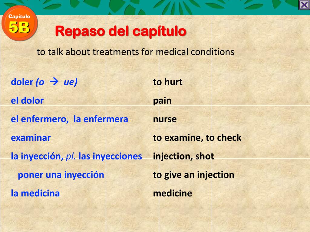Repaso del capítulo. to talk about treatments for medical conditions. doler (o ue ) el dolor el enfermero , la enfermera examinar la inyección , pl . las inyecciones poner una inyección la medicina. to hurt pain nurse to examine, to check injection, shot