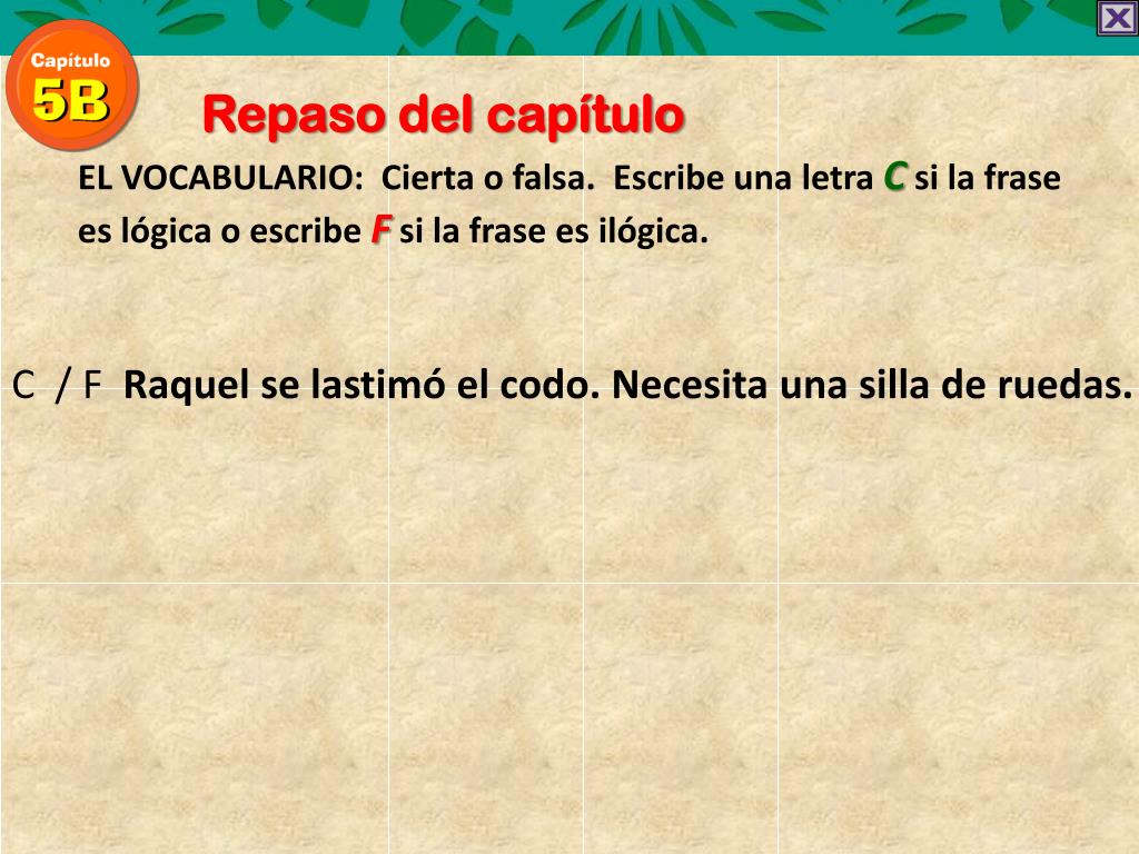 Repaso del capítulo EL VOCABULARIO: Cierta o falsa. EscribeunaletraCsi la frase eslógica o escribeFsi la fraseesilógica. C / F Raquel se lastimó el codo. Necesita una silla de ruedas.