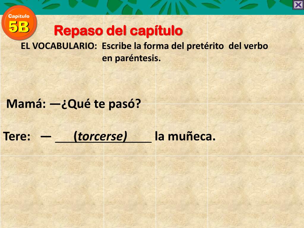 Repaso del capítulo EL VOCABULARIO: Escribe la forma del pretérito del verbo en paréntesis. Mamá: —¿Qué te pasó? Tere: — (torcerse) la muñeca.
