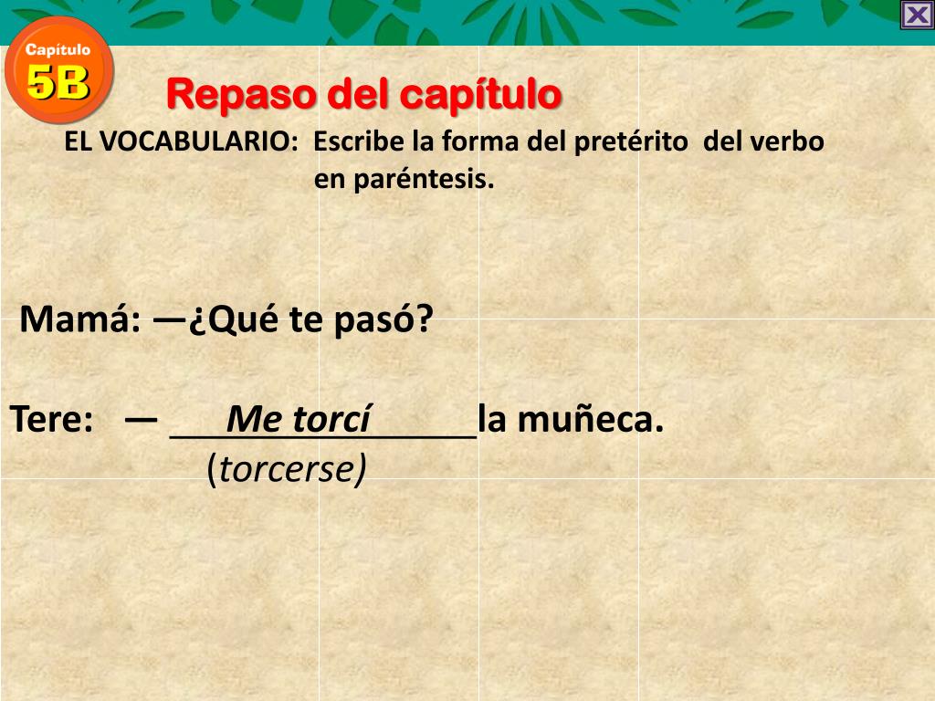 Repaso del capítulo EL VOCABULARIO: Escribe la forma del pretérito del verbo en paréntesis. Mamá: —¿Qué te pasó? Tere: — Me torcí la muñeca. (torcerse)