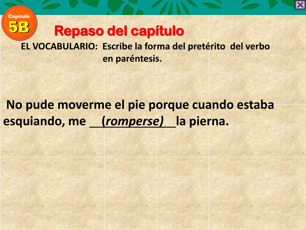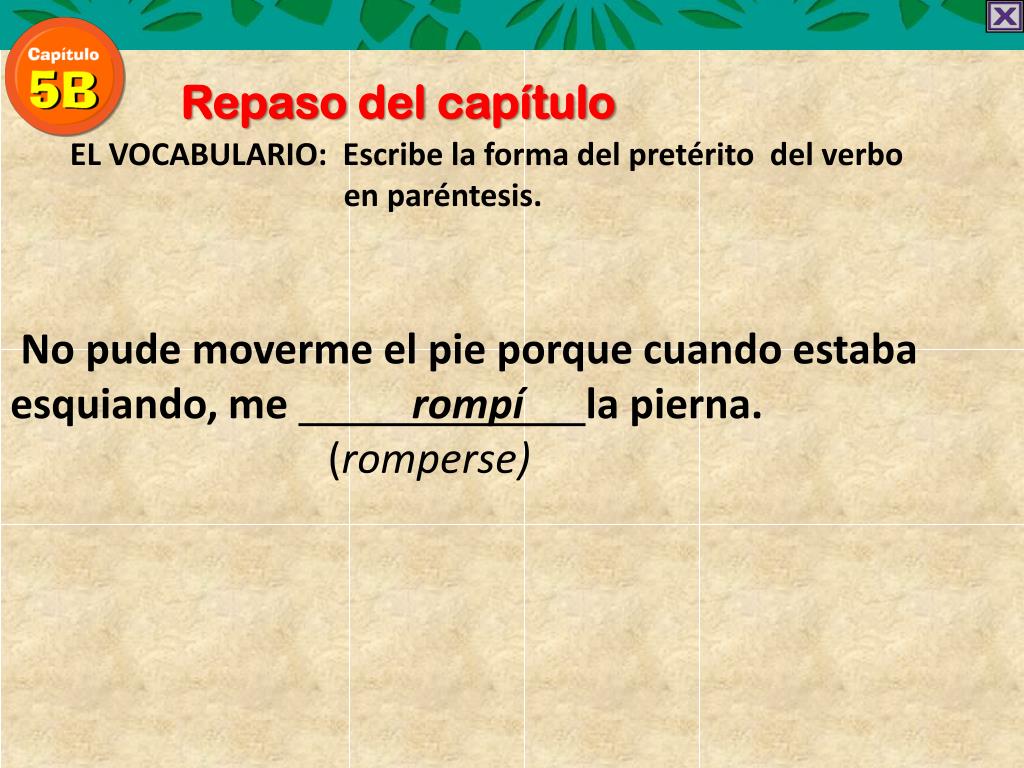 Repaso del capítulo EL VOCABULARIO: Escribe la forma del pretérito del verbo en paréntesis. No pude moverme el pie porque cuando estaba esquiando, me rompíla pierna. (romperse)