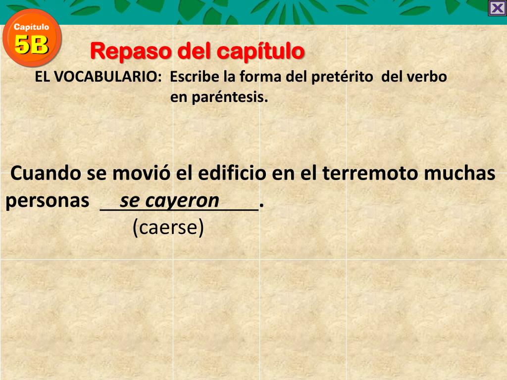 Repaso del capítulo EL VOCABULARIO: Escribe la forma del pretérito del verbo en paréntesis. Cuando se movió el edificio en el terremoto muchas personas se cayeron. (caerse)