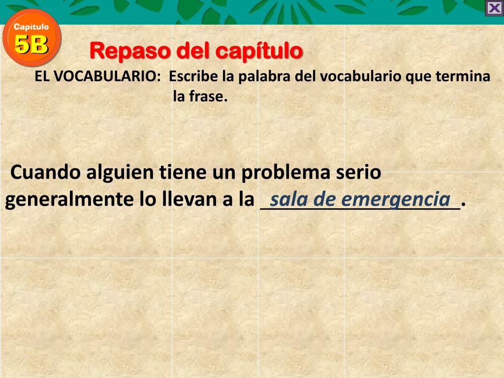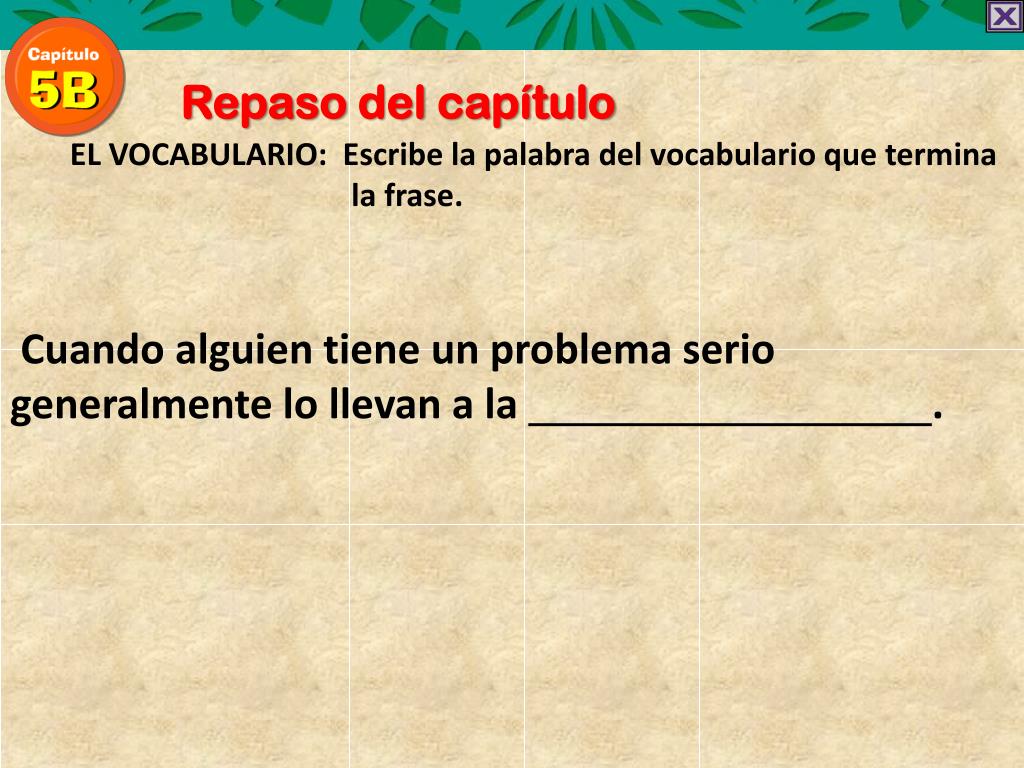 Repaso del capítulo EL VOCABULARIO: Escribe la palabra del vocabularioquetermina la frase. Cuando alguien tiene un problema serio generalmente lo llevan a la .