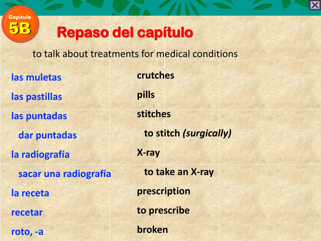 Repaso del capítulo to talk about treatments for medical conditions crutches pills stitches to stitch (surgically) X-ray to take an X-rayprescription to prescribe broken lasmuletas laspastillas laspuntadas darpuntadas la radiografía sacarunaradiografía la receta recetar roto, -a