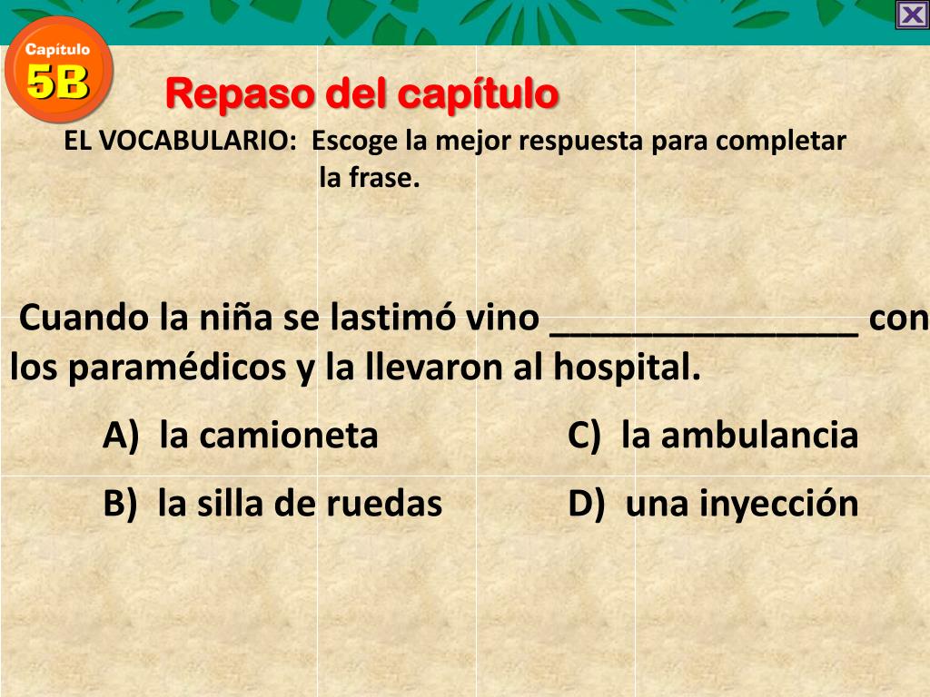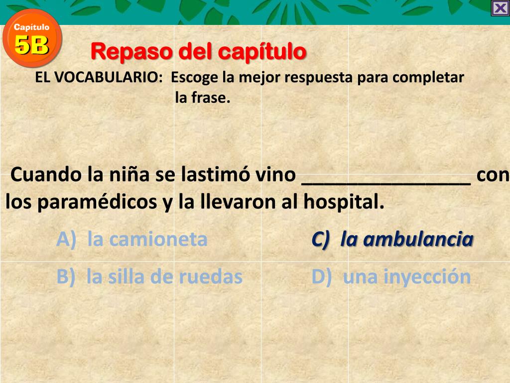 Repaso del capítulo EL VOCABULARIO: Escoge la mejorrespuestaparacompletar la frase. Cuando la niña se lastimó vino _______________ con los paramédicos y la llevaron al hospital. A) la camionetaC) la ambulancia B) la silla de ruedas D) una inyección