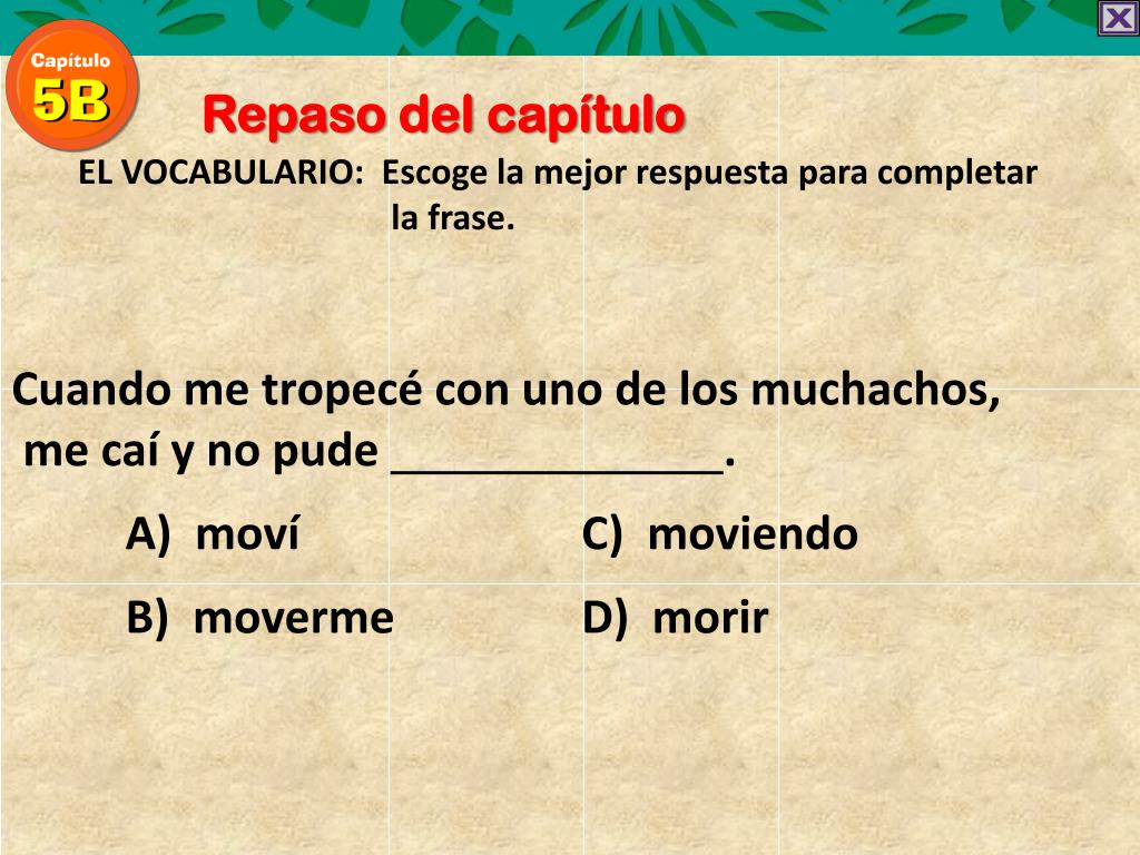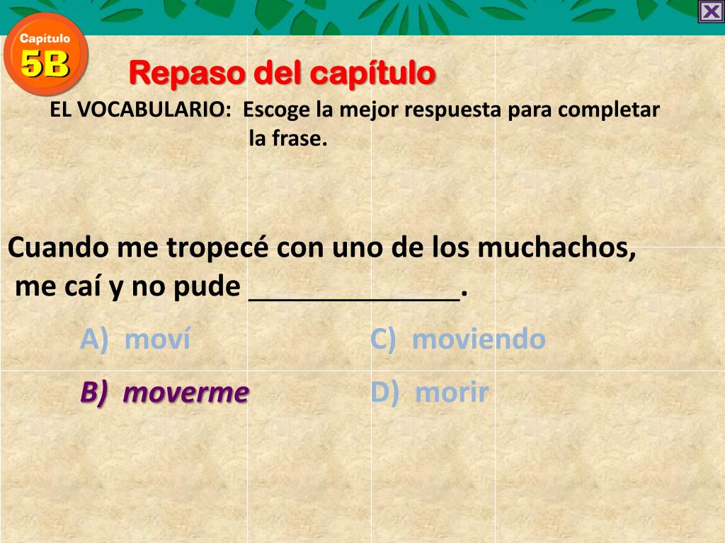 Repaso del capítulo EL VOCABULARIO: Escoge la mejorrespuestaparacompletar la frase. Cuando me tropecé con uno de los muchachos, me caí y no pude . A) moví C) moviendo B) movermeD) morir