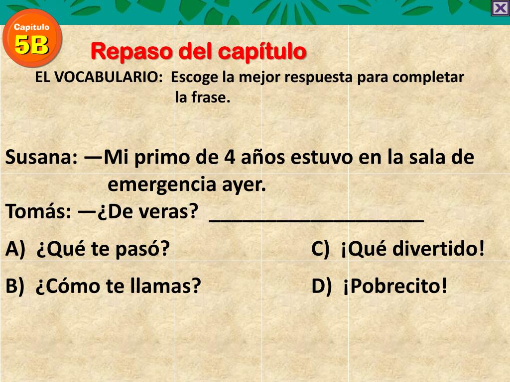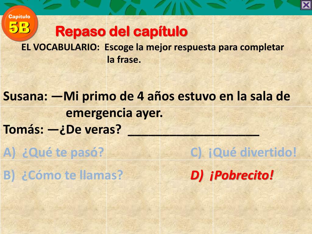 Repaso del capítulo EL VOCABULARIO: Escoge la mejorrespuestaparacompletar la frase. Susana: —Mi primo de 4 años estuvo en la sala de emergencia ayer. Tomás: —¿De veras? ___________________ A) ¿Qué te pasó? C) ¡Qué divertido! B) ¿Cómo te llamas? D) ¡Pobrecito!