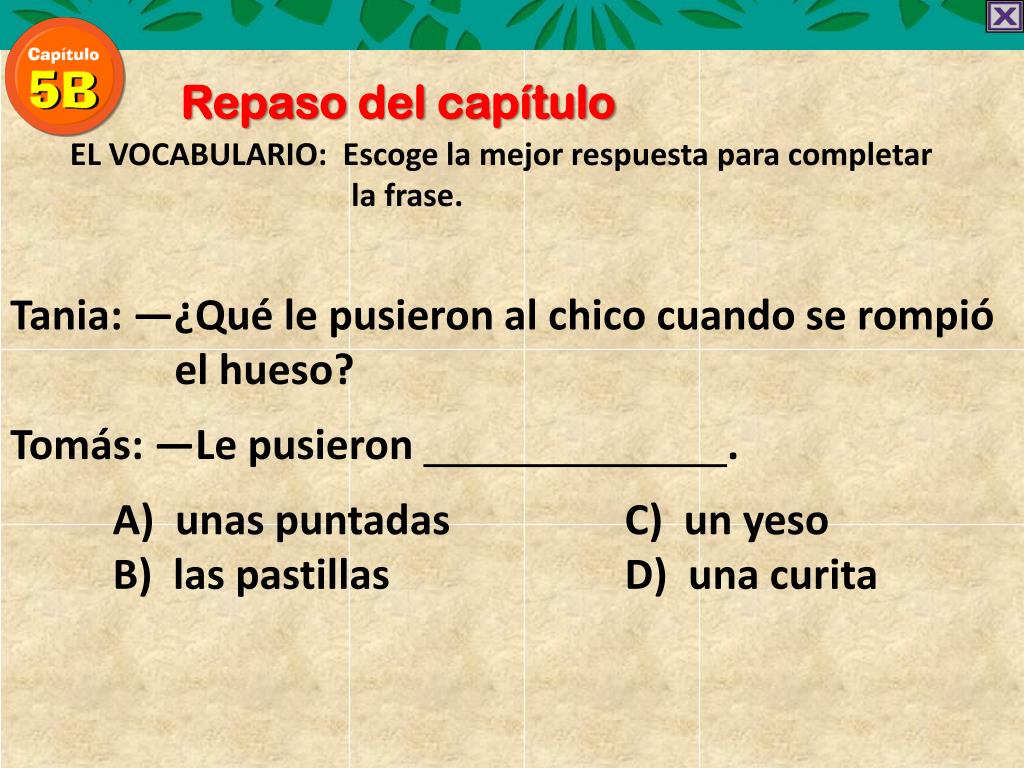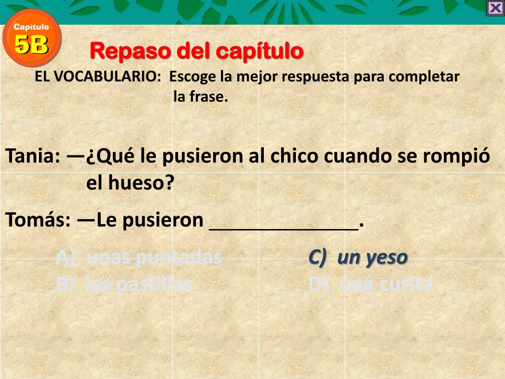 Repaso del capítulo EL VOCABULARIO: Escoge la mejorrespuestaparacompletar la frase. Tania: —¿Qué le pusieron al chico cuando se rompió el hueso? Tomás: —Le pusieron . A) unas puntadas C) un yeso B) las pastillas D) una curita