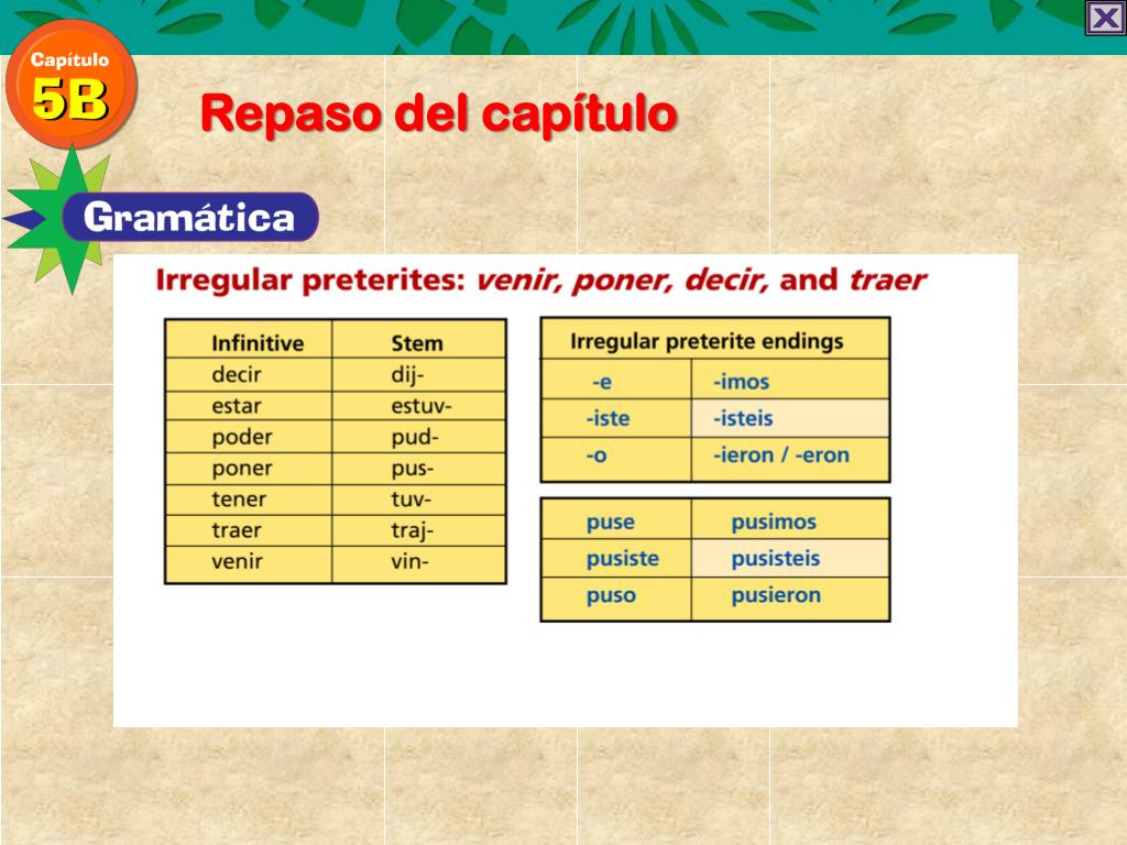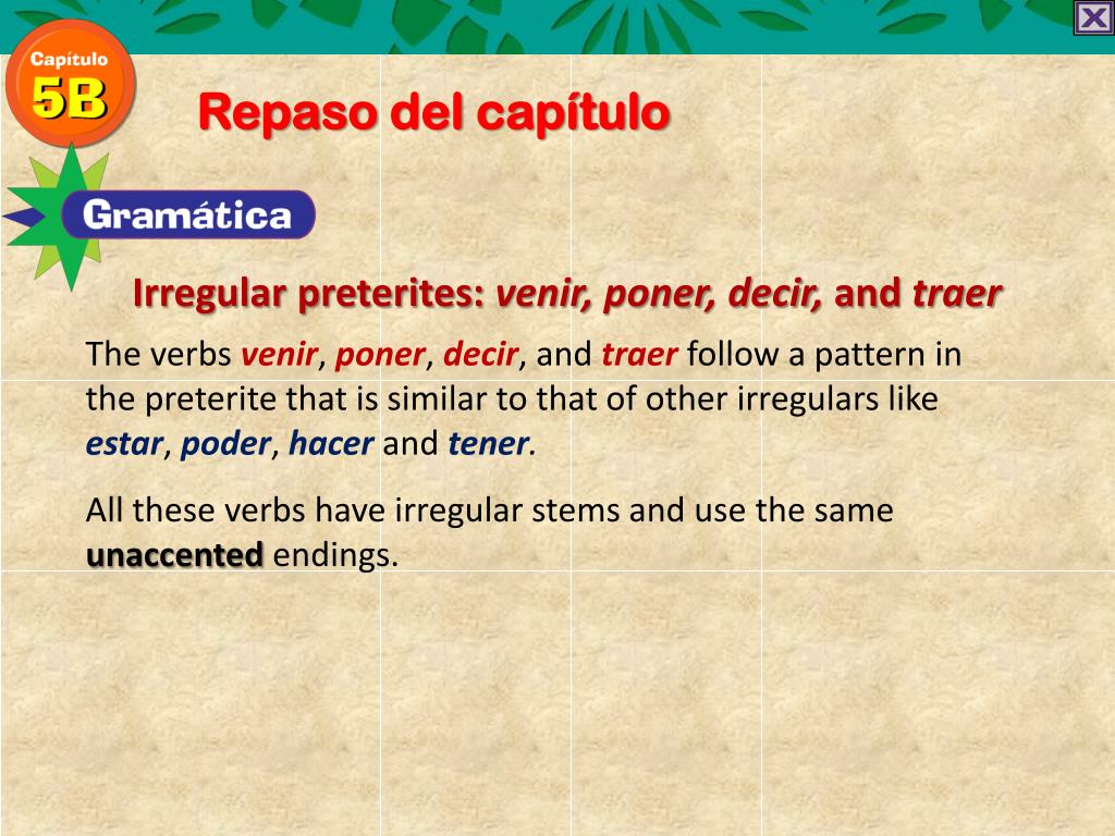 Repaso del capítulo Irregular preterites: venir, poner, decir, and traer The verbs venir,poner,decir,andtraerfollow a pattern in the preterite that is similar to that of other irregulars like estar,poder,hacerand tener. All these verbs have irregular stems and use the same unaccentedendings.
