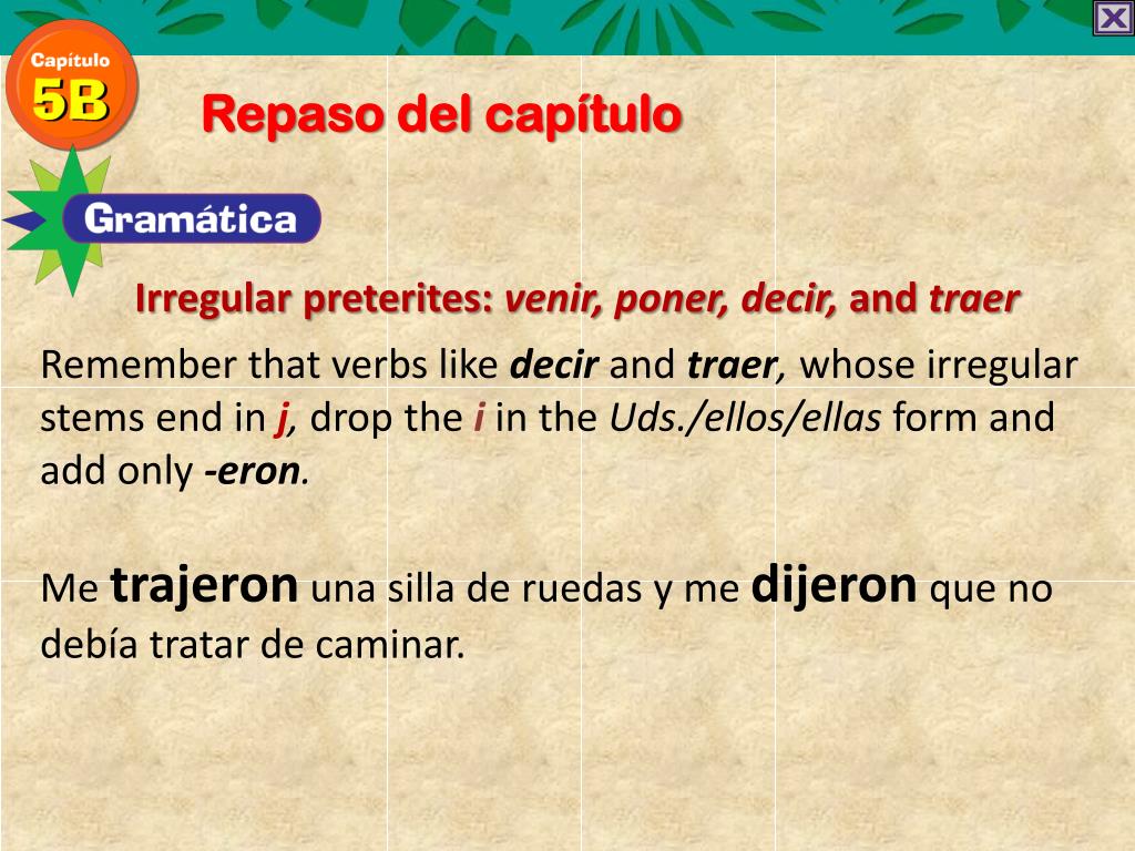 Repaso del capítulo Irregular preterites: venir, poner, decir, and traer Remember that verbs like decirand traer, whose irregular stems end in j, drop the iin the Uds./ellos/ellasform and add only -eron. Me trajeronunasilla de ruedas y me dijeronque no debíatratar de caminar.