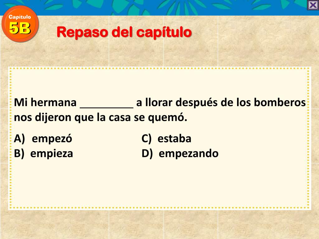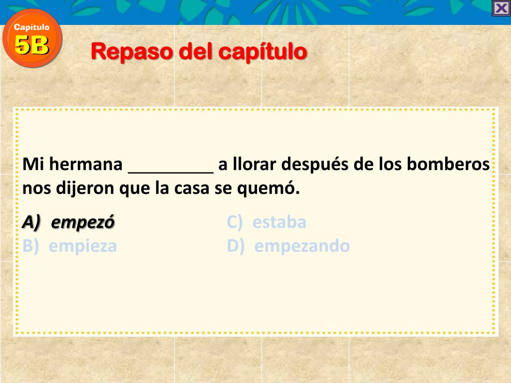 Repaso del capítulo Mi hermana a llorar después de los bomberos nos dijeron que la casa se quemó. empezó C) estaba B) empieza D) empezando