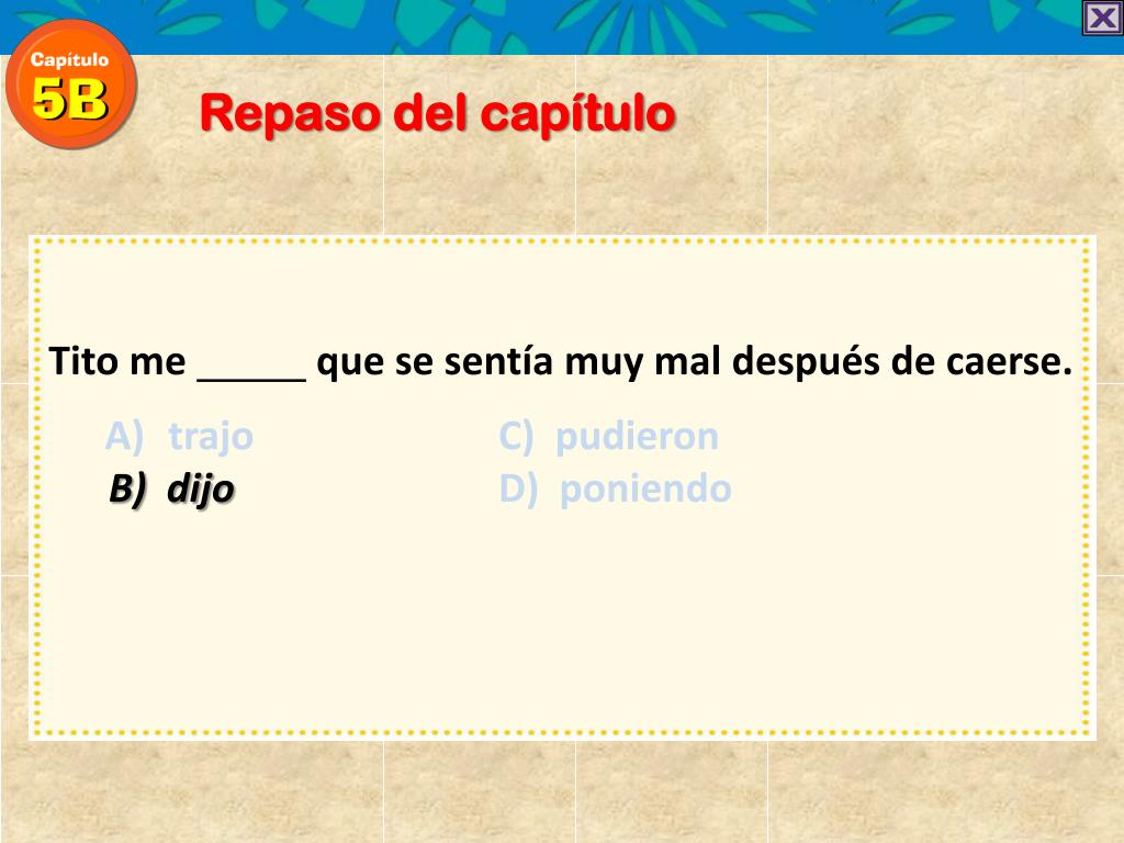 Repaso del capítulo • Tito me que se sentía muy mal después de caerse. • trajo C) pudieron • B) dijo D) poniendo