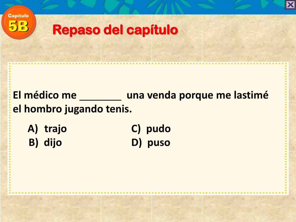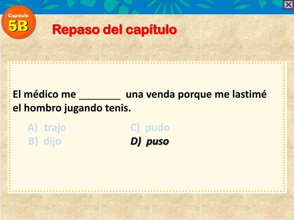 Repaso del capítulo • El médico me una venda porque me lastimé el hombro jugando tenis. • trajo C) pudo • B) dijo D) puso