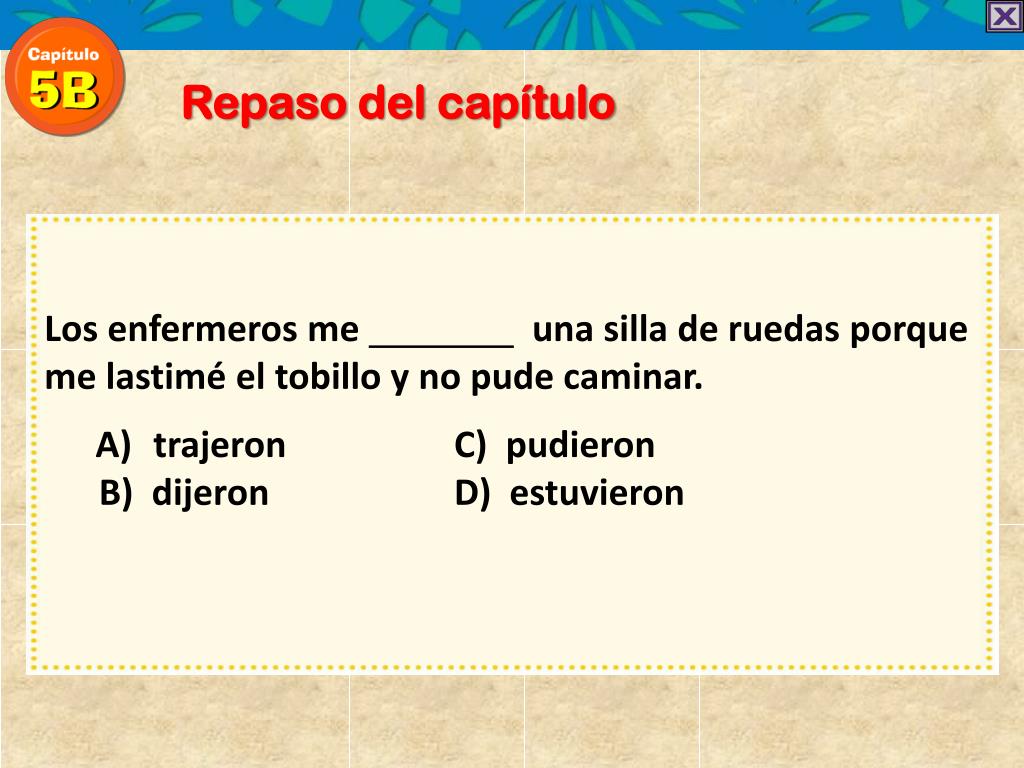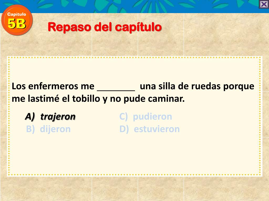 Repaso del capítulo • Los enfermeros me una silla de ruedas porque me lastimé el tobillo y no pude caminar. • trajeronC) pudieron • B) dijeron D) estuvieron