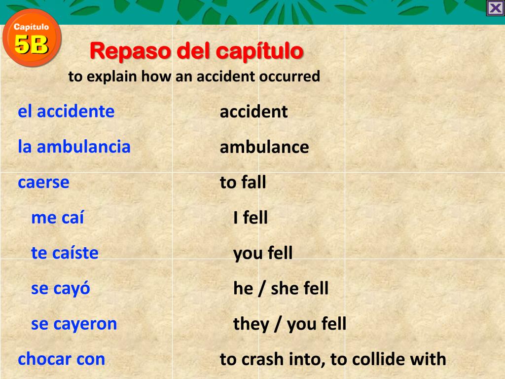 Repaso del capítulo to explain how an accident occurred el accidente la ambulancia caerse me caí tecaíste se cayó se cayeron chocar con accident ambulance to fall I fell you fell he / she fell they / you fell to crash into, to collide with