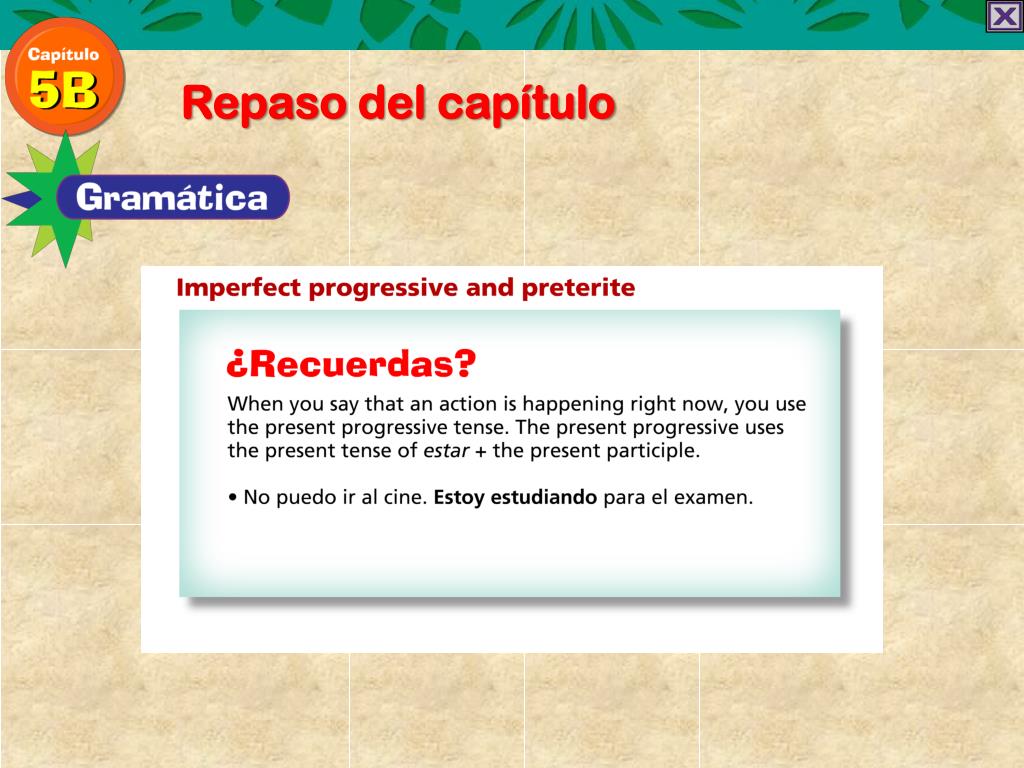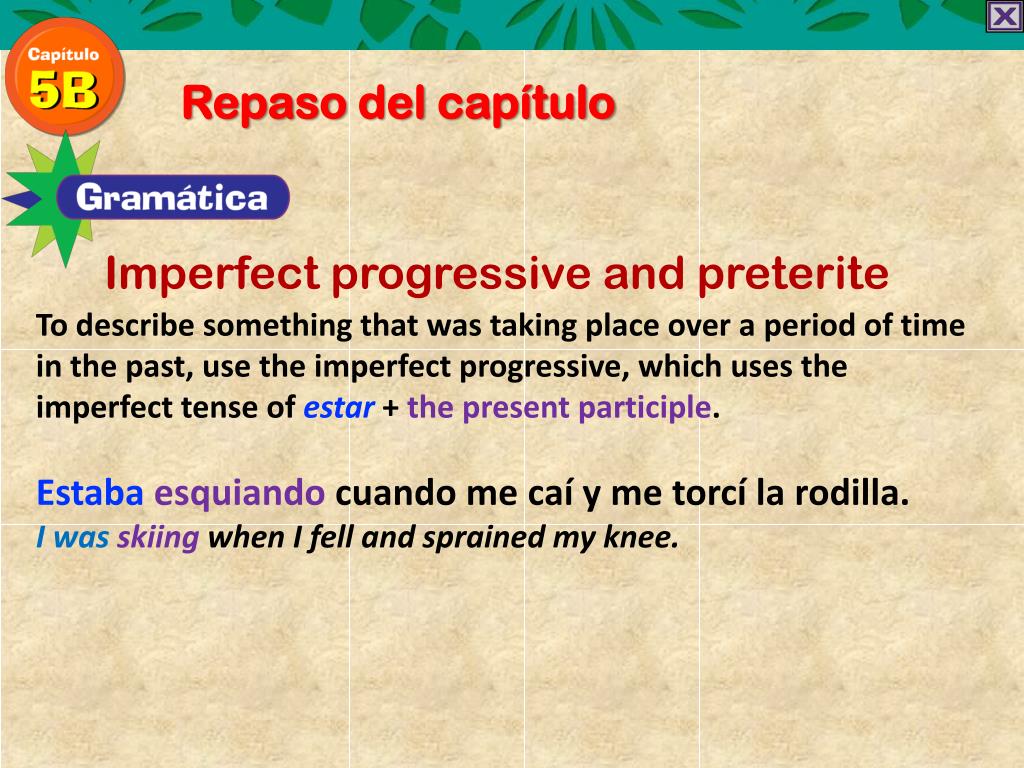 Repaso del capítulo Imperfect progressive and preterite To describe something that was taking place over a period of time in the past, use the imperfect progressive, which uses the imperfect tense of estar+ the present participle. Estabaesquiandocuando me caí y me torcí la rodilla. I was skiing when I fell and sprained my knee.