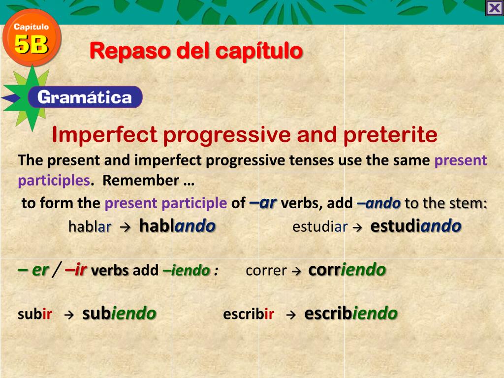 Repaso del capítulo Imperfect progressive and preterite The present and imperfect progressive tenses use the same present participles. Remember … to form the present participle of –arverbs, add –andoto the stem: hablarhablandoestudiarestudiando – er/–irverbs add –iendo: corrercorriendo subirsubiendoescribirescribiendo