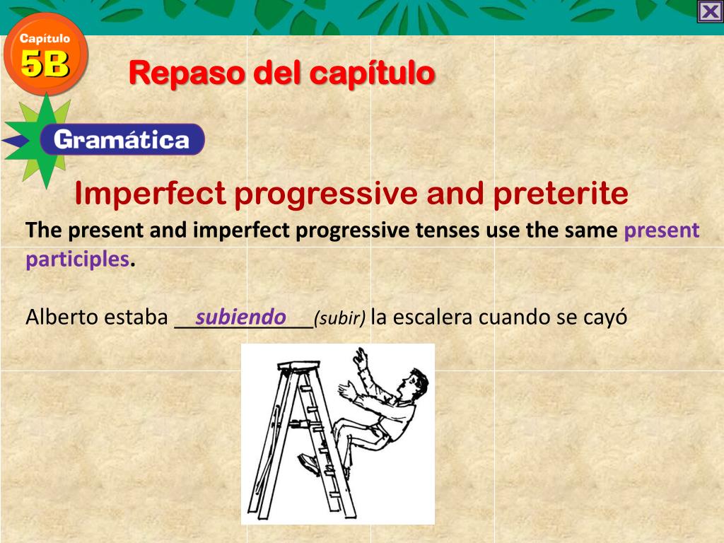 Repaso del capítulo Imperfect progressive and preterite The present and imperfect progressive tenses use the same present participles. Alberto estabasubiendo(subir) la escaleracuando se cayó