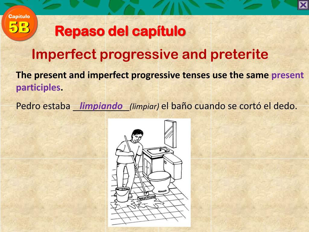 Repaso del capítulo Imperfect progressive and preterite The present and imperfect progressive tenses use the same present participles. Pedro estabalimpiando(limpiar) el bañocuando se cortó el dedo.
