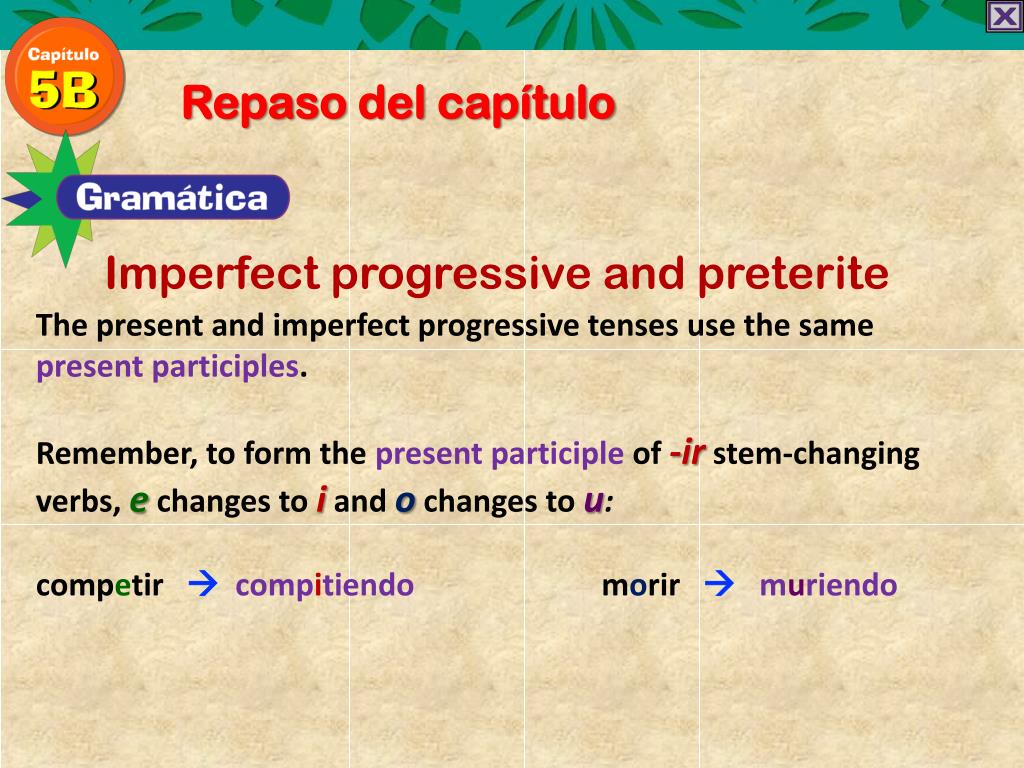 Repaso del capítulo Imperfect progressive and preterite The present and imperfect progressive tenses use the same present participles. Remember, to form the present participle of -irstem-changing verbs, echanges to iand ochanges to u: competir compitiendomorir muriendo