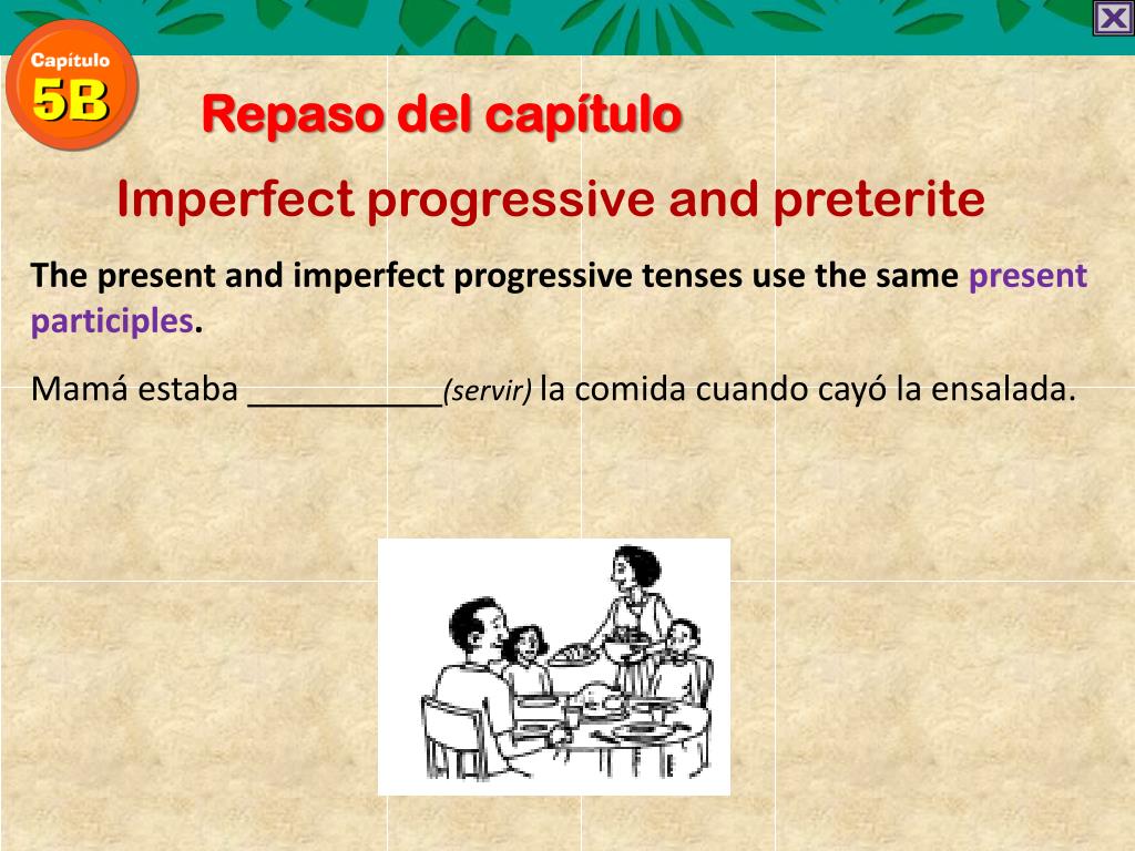 Repaso del capítulo Imperfect progressive and preterite The present and imperfect progressive tenses use the same present participles. Mamáestaba(servir) la comida cuandocayó la ensalada.