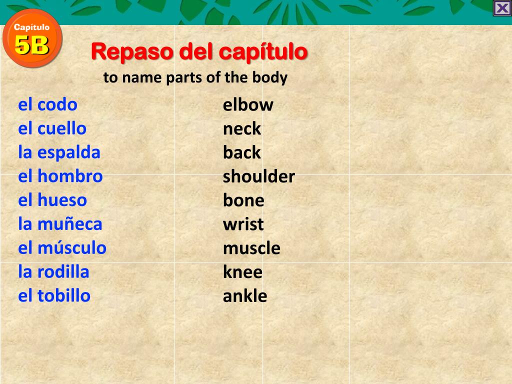 Repaso del capítulo to name parts of the body el codo el cuello la espalda el hombro el hueso la muñeca el músculo la rodilla el tobillo elbow neck back shoulder bone wrist muscle knee ankle